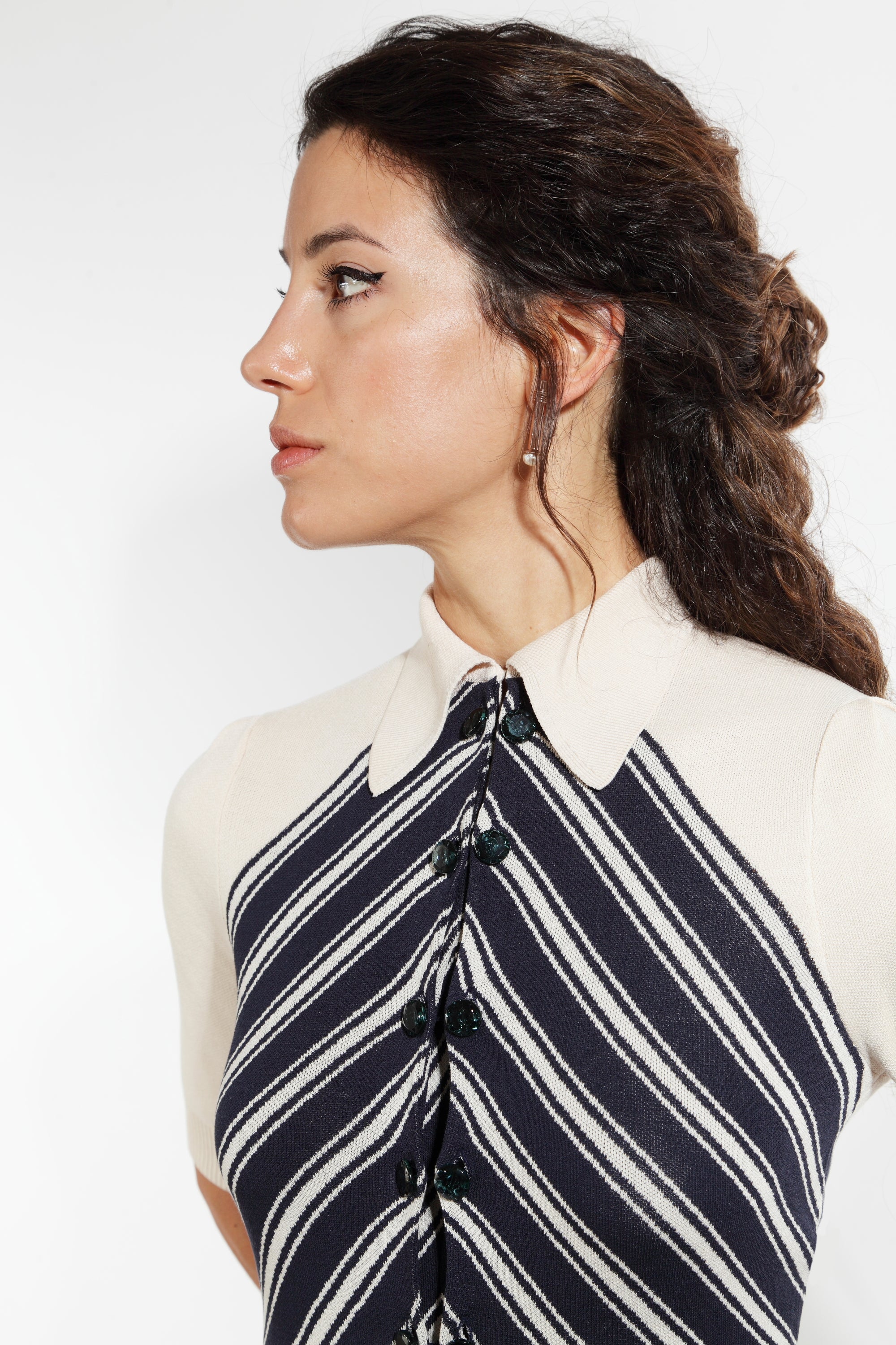 With diagonal stripes that wrap uninterruptedly around the body to accentuate your natural curves, this piece was designed to strut unapologetically down beautiful corridors, turning heads in its wake...